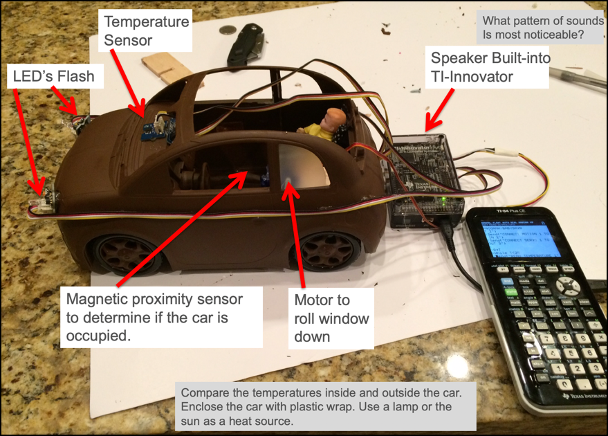 Images Display Image of sun rays striking automobile link Display Table of internal auto temperatures vs. time link Display Image of example Pet Car Alarm Project link Display Image of TI-Innovator Hub set-up diagram for Pet Car Alarm Project link